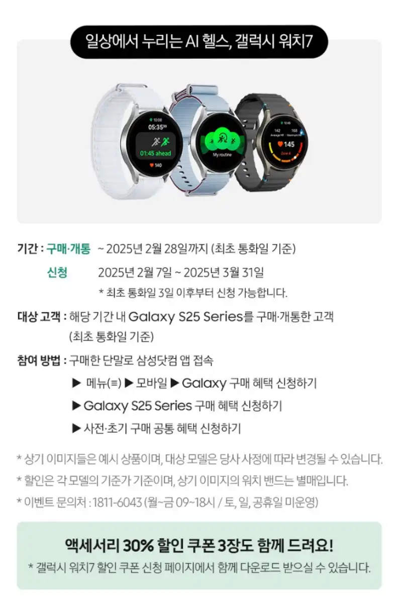 - 갤럭시 워치 7 15만원 할인구매: 25년 2월 28일까지 구매하고 개통한 경우, 구매한 핸드폰 단말기로 갤럭시 워치를 주문하면 15만원을 할인해줍니다. 워치를 사려고 생각하셨던 분들에게는 아주 큰 혜택입니다. 기간이 정해져 있으니 구매일과 신청마감일 잘 확인하세요!
