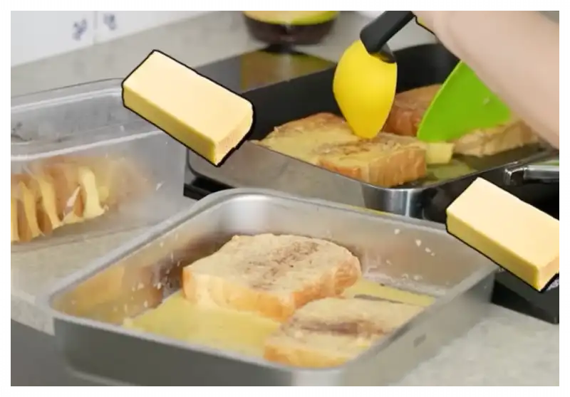 - 굽기: 중약불로 예열한 팬에 버터 1/2조각을 녹인 후, 계란물에 적신 빵을 올려 앞뒤로 노릇하게 구워주세요. 팬에 굽고 오븐에 한 번 더 구우면 맛이 더 풍부해집니다.