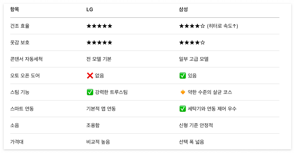 💡 정리하자면: ➡ 옷감 보호 중심이면 LG / 빠른 건조와 강한 열풍을 원하면 삼성